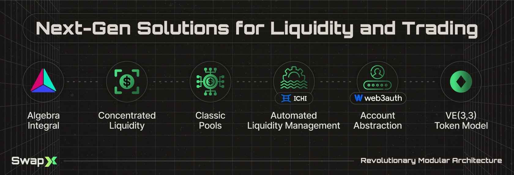 Our goal is to foster collaboration among decentralized finance (DeFi) projects to deliver comprehensive and innovative solutions. For this reason, we have partnered with multiple projects in the space to provide the best possible experience for SwapX users. Details about the various architectural solutions will be described later in this document.